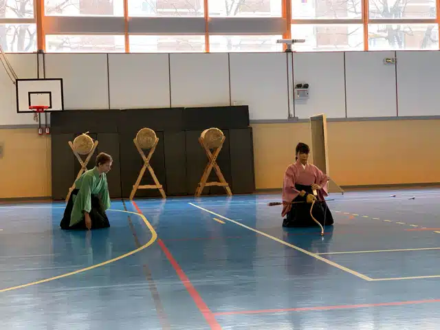 En général, les archers de niveau 3eme dan ou plus doivent être capables d’assumer toutes ces fonctions.Lors du tournoi mensuel de l’AKE, les participants tirent 12 flèches en individuel.